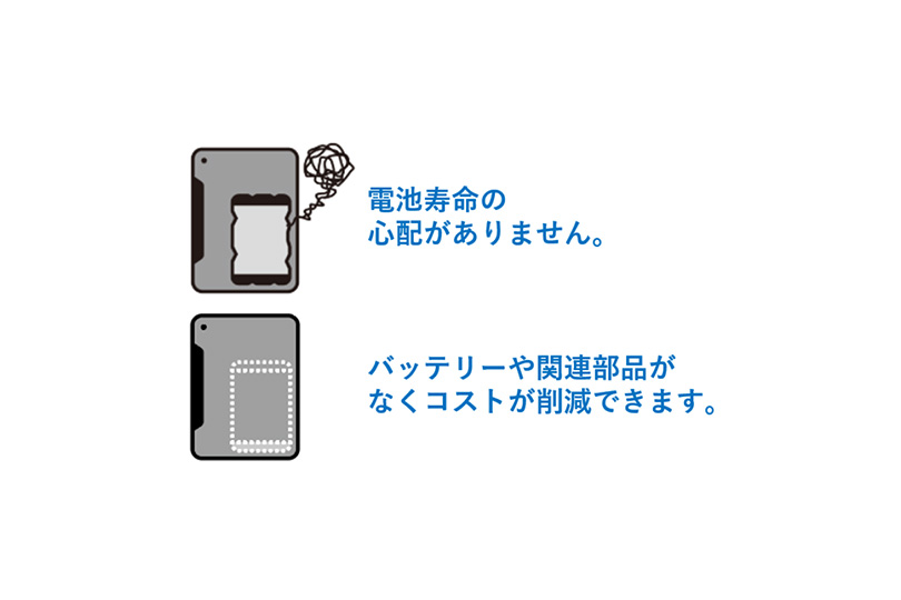 バッテリー非搭載によりバッテリーの経年劣化によるトラブルを事前に回避することができます。