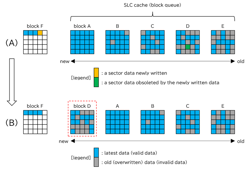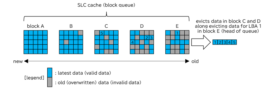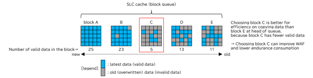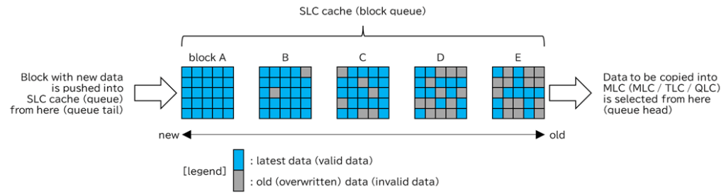 SLCキャッシュの容量が満杯に達したなどの理由でSLCキャッシュ内のデータを多値記録領域に移動させる際、このキューの先頭ブロックを選択します。そして選択したブロックに記録されている有効データを多値記録領域にコピーします。このコピーによりSLCキャッシュから選択したコピー元ブロックは消去可能となり、SLCキャッシュの容量を空けることができます。