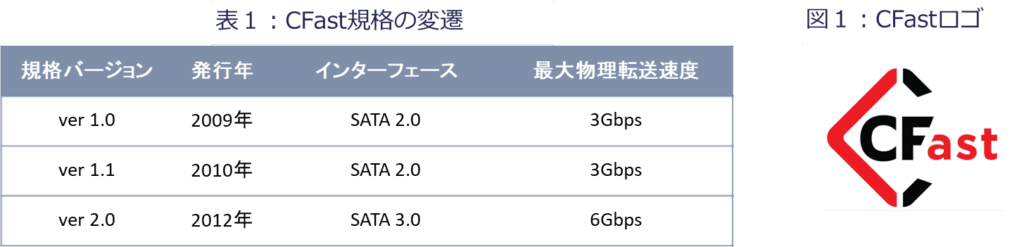 CFast規格ver1.0は2009年に規格化され、2010年に一部修正のVer1.1としての発行を経て、Ver2.0が2012年12月に規格化されて以降、現在まで続いています。