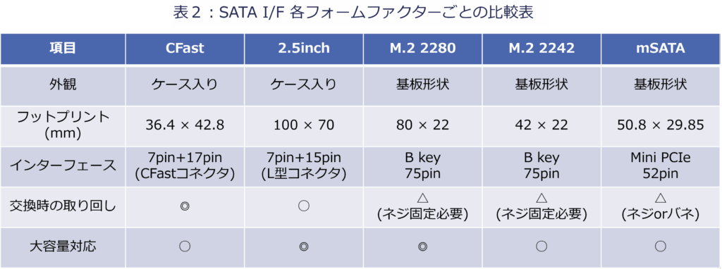 CFastのメリットについて、その他のSATA I/Fの代表的なフォームファクターと表2にて比較してみました。