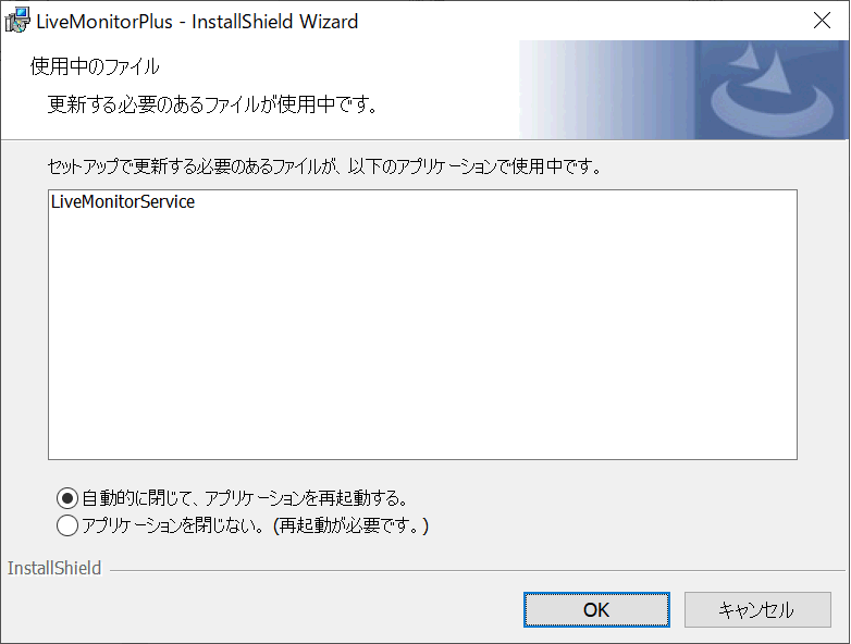 その際は「自動的に閉じて、アプリケーションを再起動する」を選択し、[OK]ボタンを押してください。